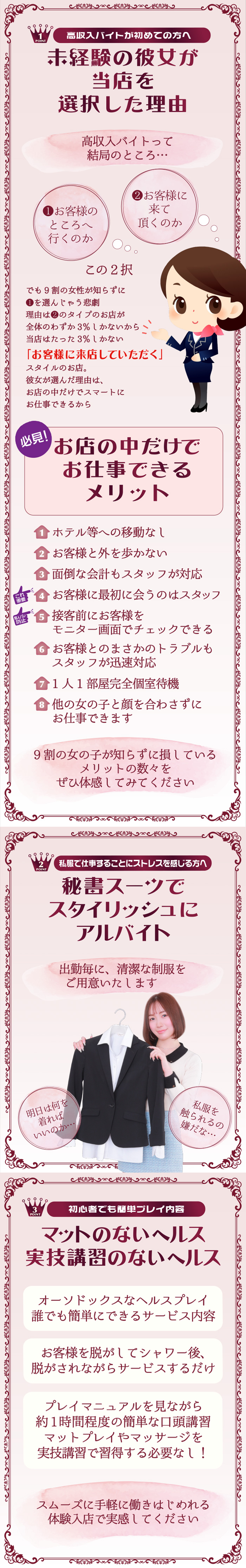 | 給与 | ・60分10,000円~ ・75分12,000円~ ・90分14,000円~ ※指名の給料となります。 当日、月間と2つの角度から独自のポイント制度を設けており、毎日基本給がUPするシステムです。やる気と頑張りさえあれば、誰でもトップランクの給料をその日に獲得可能です。さらに詳しくは面接時に丁寧にご説明致します。 |